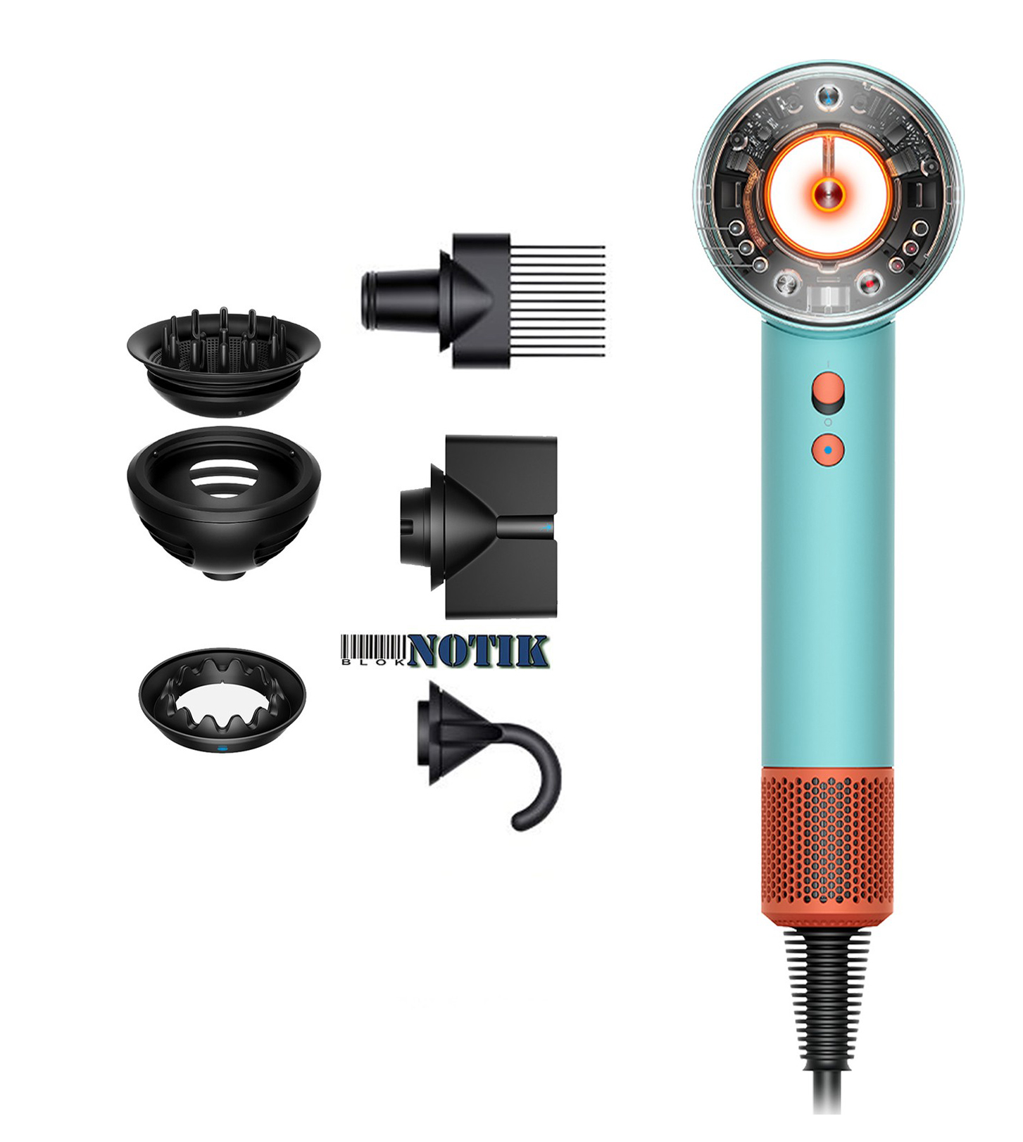 Насадки та комплектація:концентратор,дифузор,насадка для прикореневого об'єму,насадка для делікатного сушіння,насадка для усунення пухнасті